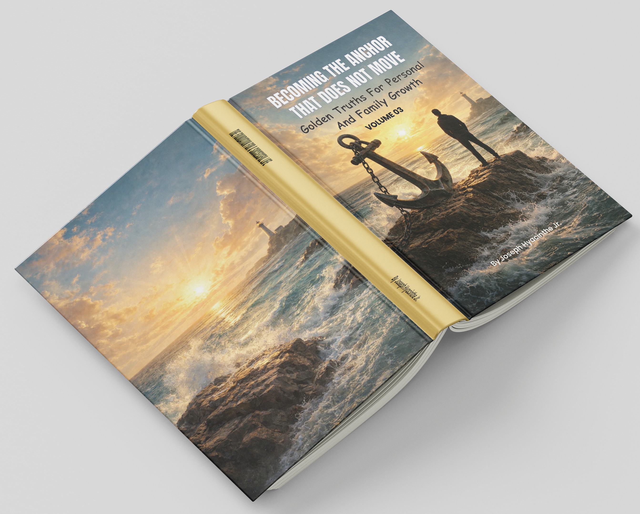 Open hardcover book mockup featuring the title “Becoming the Anchor That Does Not Move: Golden Truths for Personal and Family Growth, Volume 03.” The cover shows a person standing on rocky shoreline next to a large anchor at sunrise, with ocean waves cras